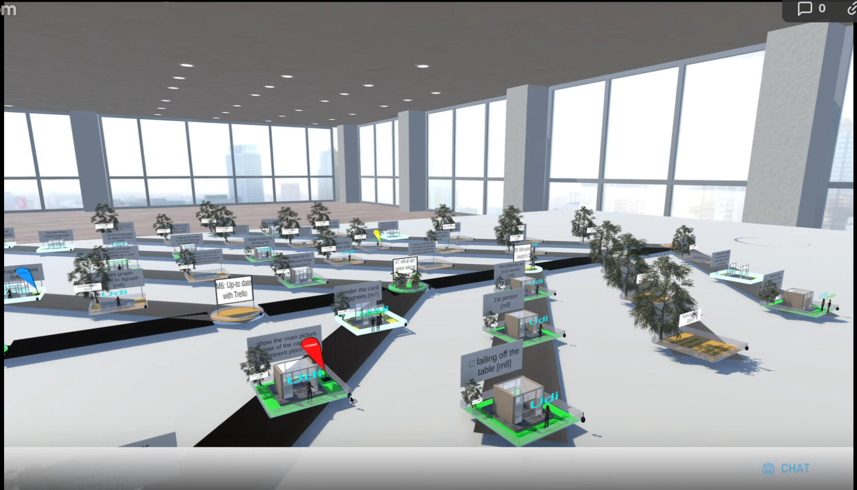 Teams live on different floors of buildings within the organization’s campus. A manager can see what is going on with each team from the outside, then click into any team’s space for more detail. They are transported inside the space to see: